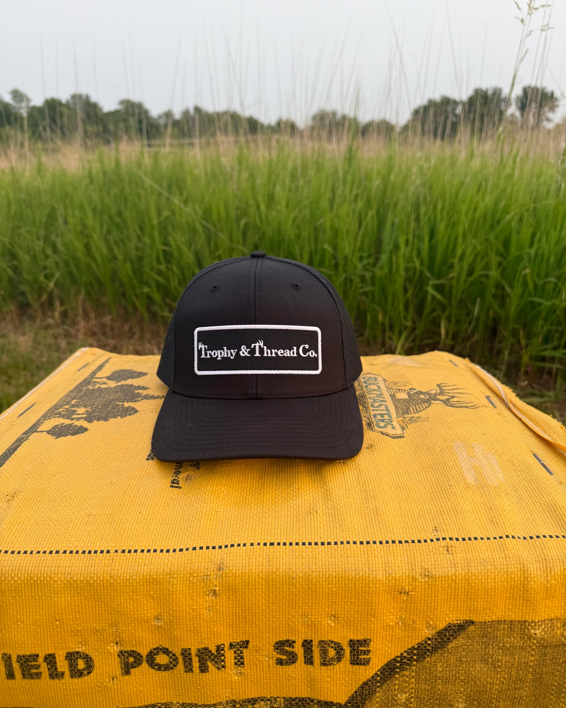 Six panel trucker hat in black with Trophy & Thread Co patch and adjustable snapback.